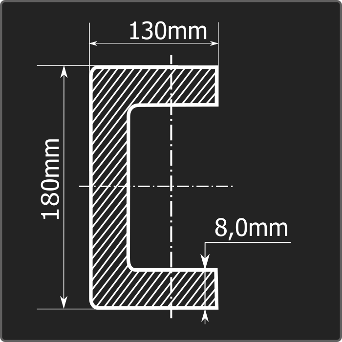 Швеллер стальной холоднокатаный гнутый равнополочный 180*130мм, толщиной 8,0мм и длиной 12м. Материал - углеродистая сталь. Соответствует требованиям ГОСТ 8278-83.