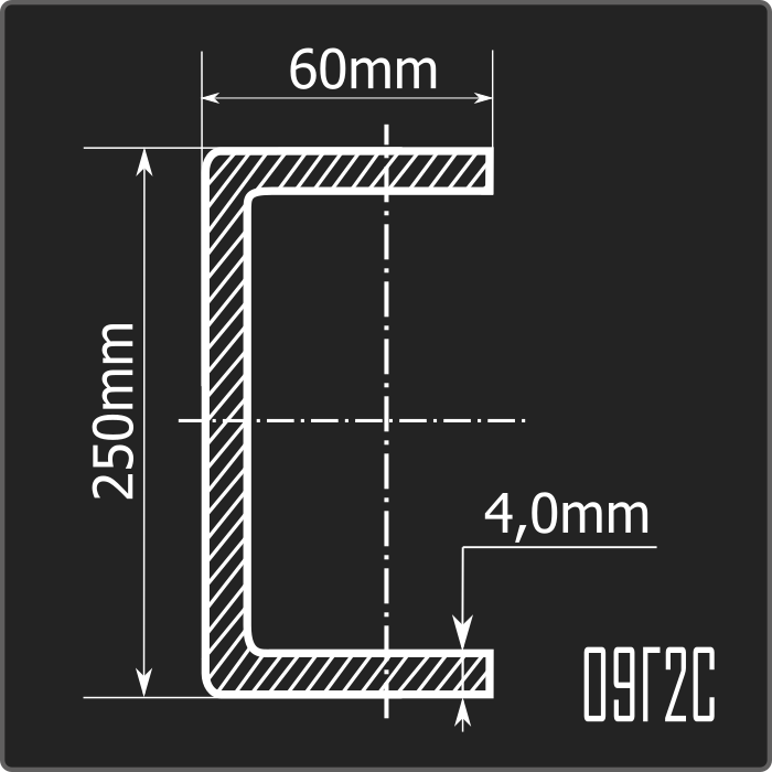 Швеллер стальной холоднокатаный гнутый равнополочный 250*60мм, толщиной 4,0мм и длиной 12м. Материал - низколегированная сталь. Соответствует требованиям ГОСТ 19281-2014.