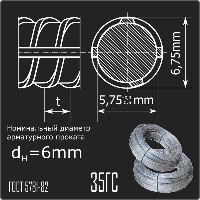 Арматурный прокат горячекатаный в мотках периодического профиля номинального диаметра dн 6,0мм класса 35ГС. Соответствует требованиям ГОСТ 5781-82.