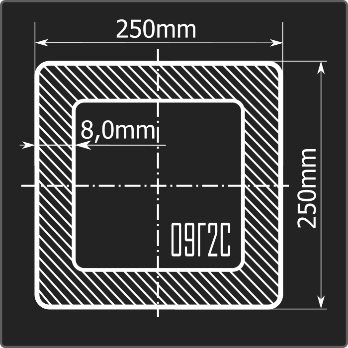 Труба профильная стальная квадратного сечения 250*250мм, длиной 12м и толщиной 8,0мм. Материал - низколегированная сталь. Соответствует требованиям ГОСТ 30245-2003. Стандартный пакет: вес - 2,836тн., количество - 4шт.