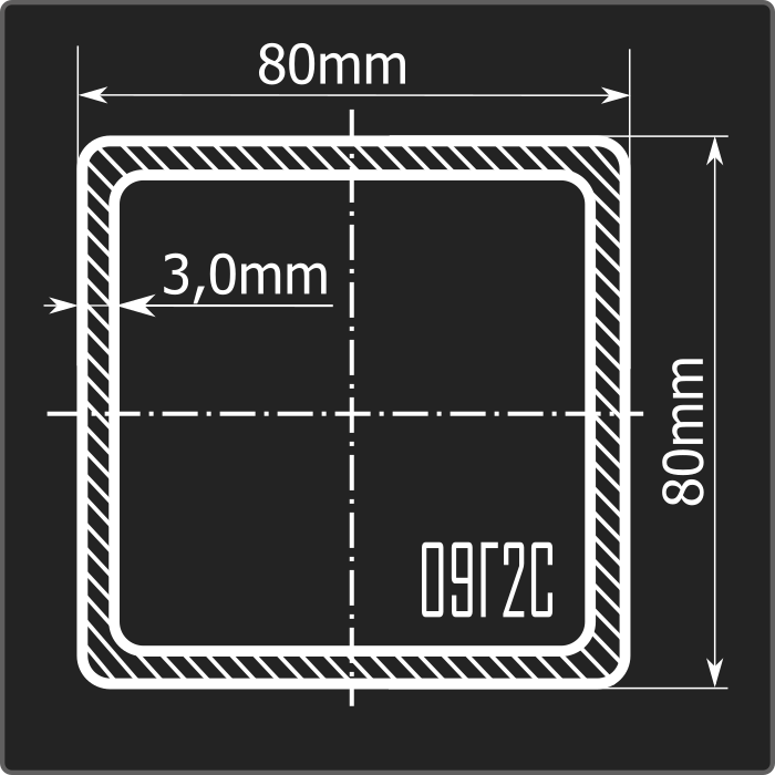 Труба профильная стальная квадратного сечения 80*80мм, длиной 12м и толщиной 3,0мм. Материал - низколегированная сталь. Соответствует требованиям ГОСТ 13663-86.