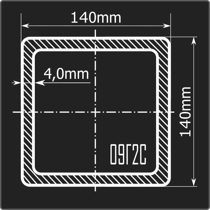Труба профильная стальная квадратного сечения 140*140мм, длиной 12м и толщиной 4,0мм. Материал - низколегированная сталь. Соответствует требованиям ГОСТ 30245-2003. Стандартный пакет: вес - 3,218тн., количество - 16шт.
