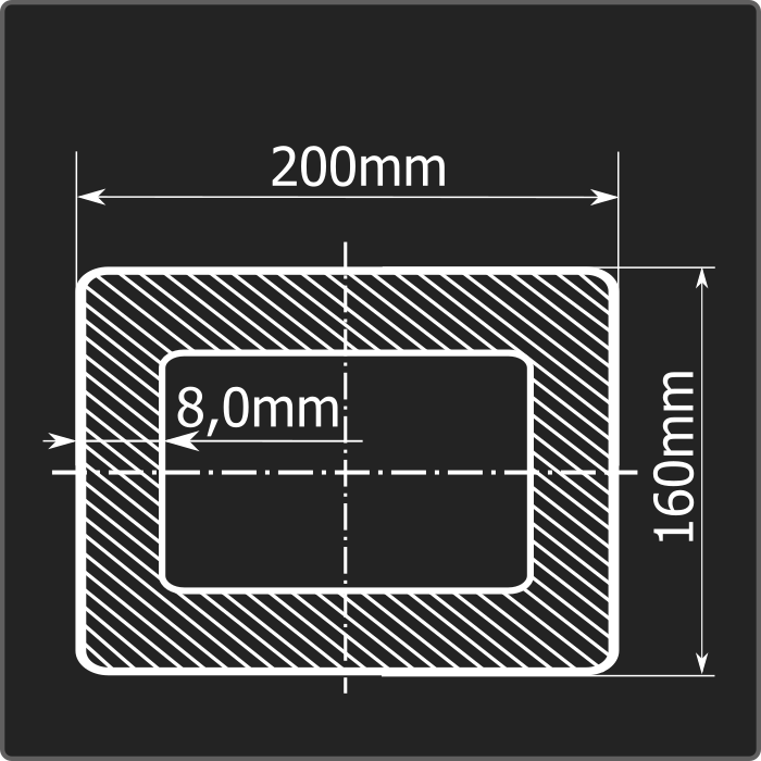 Труба профильная стальная прямоугольного сечения 200*160мм, длиной 12м и толщиной 8,0мм. Материал - углеродистая сталь. Соответствует требованиям ГОСТ 30245-2003. Стандартный пакет: вес - 4,480тн., количество - 9шт.