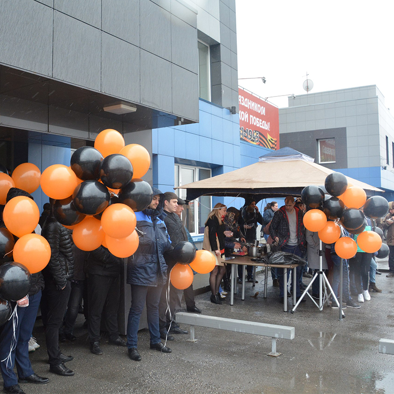 Память погибших в годы ВОВ почтили минутой молчания, в небо запустили воздушные шары, на полевой кухне для сотрудников и клиентов приготовили фронтовую кашу.